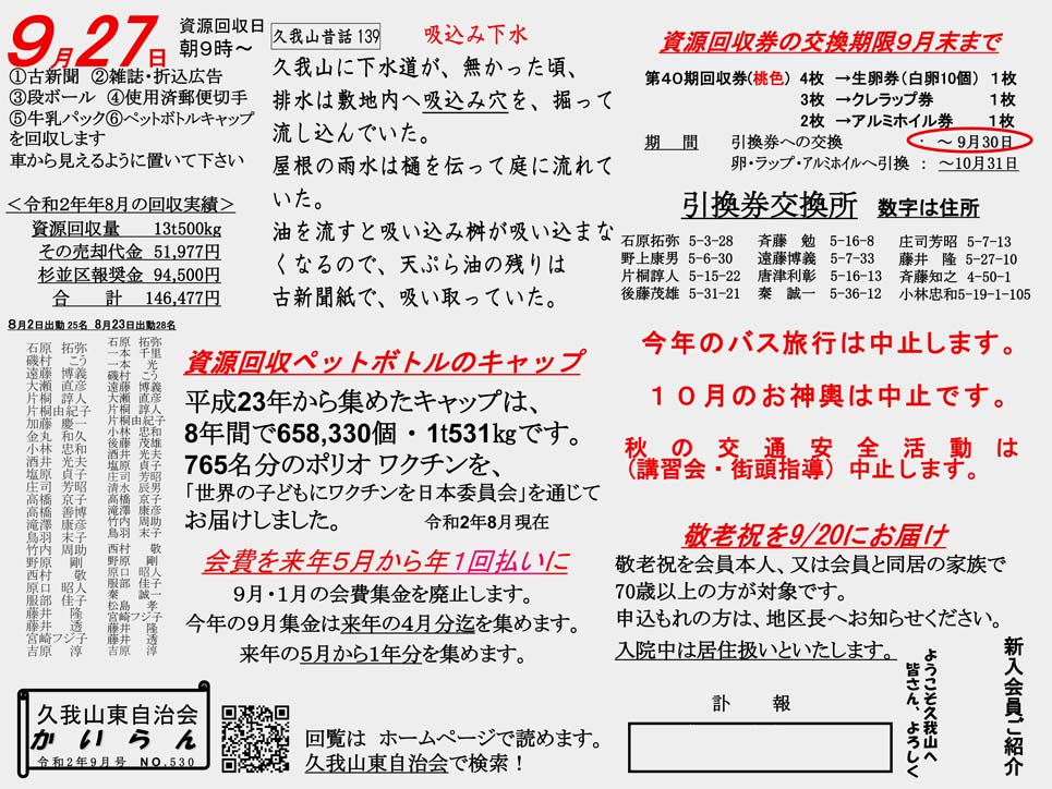 今年のバス旅行は中止。資源回収券の交換時期限は9月末です。