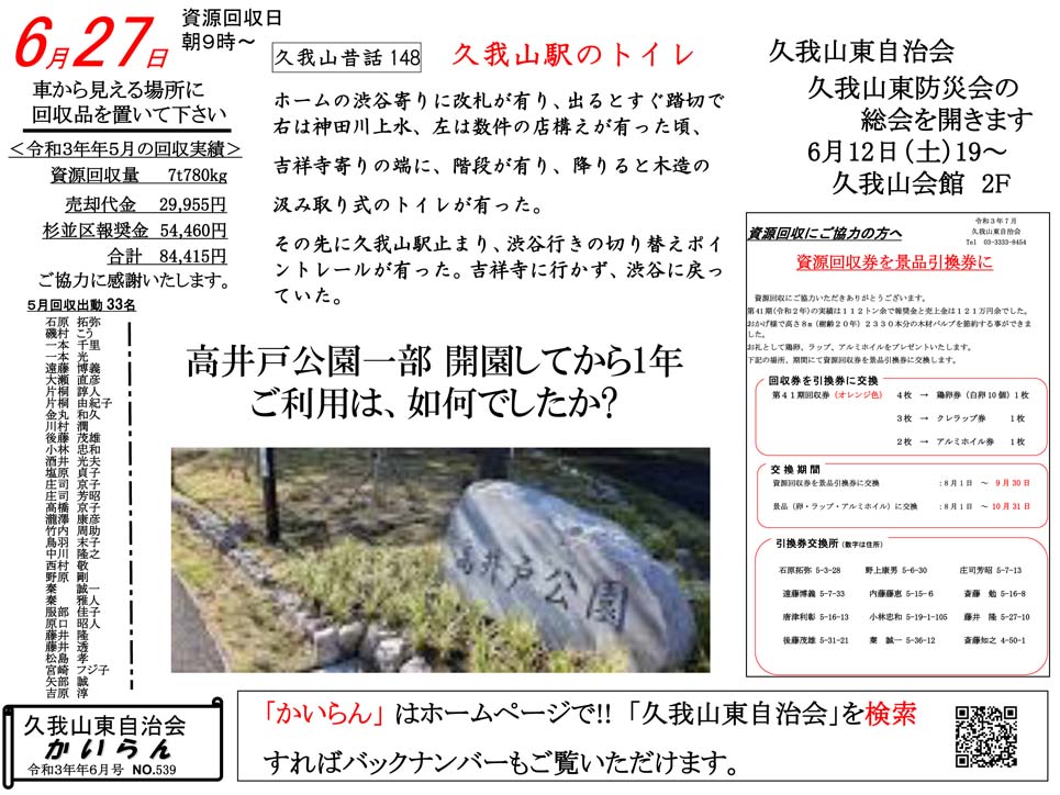 自治会及び防災会の総会は、6/12(土)に開催。資源回収券の交換ご案内。