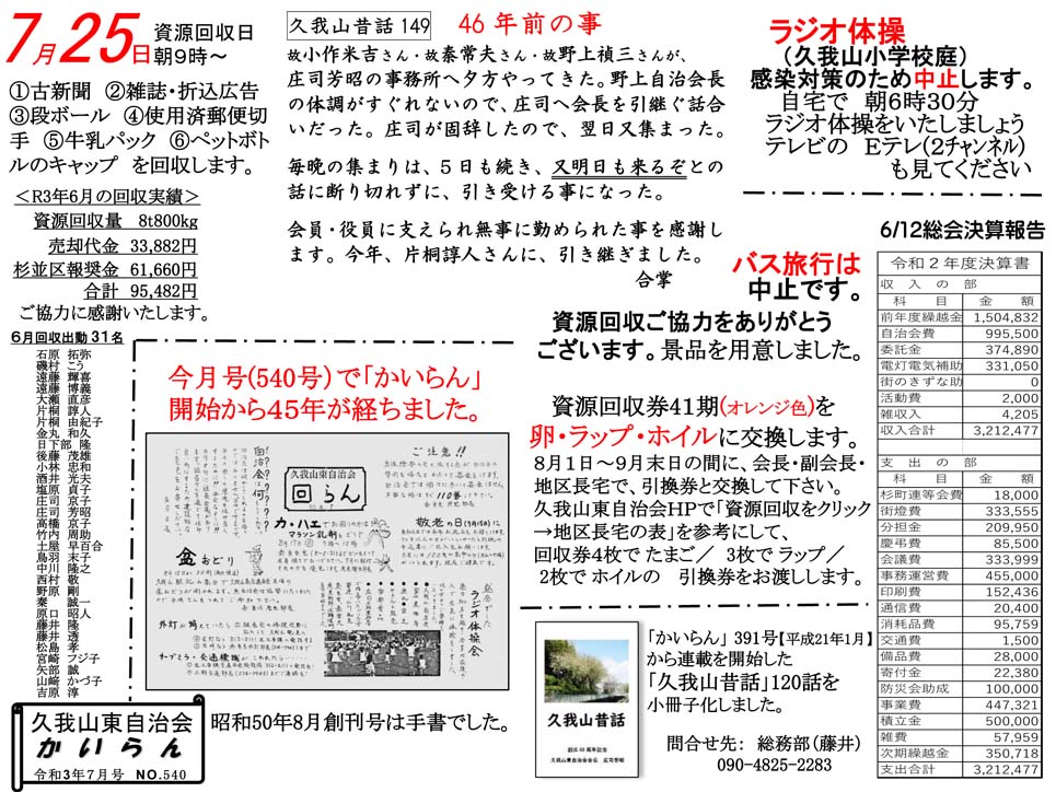 令和3年7月度回覧板 2021年7月1日 最終更新日時 : 2025年5月12日 KH01 昭和50年8月から始めた「かいらん」は今月で540号目になります。ラジオ体操は中止と決まりました。 令和3年7月度回覧板