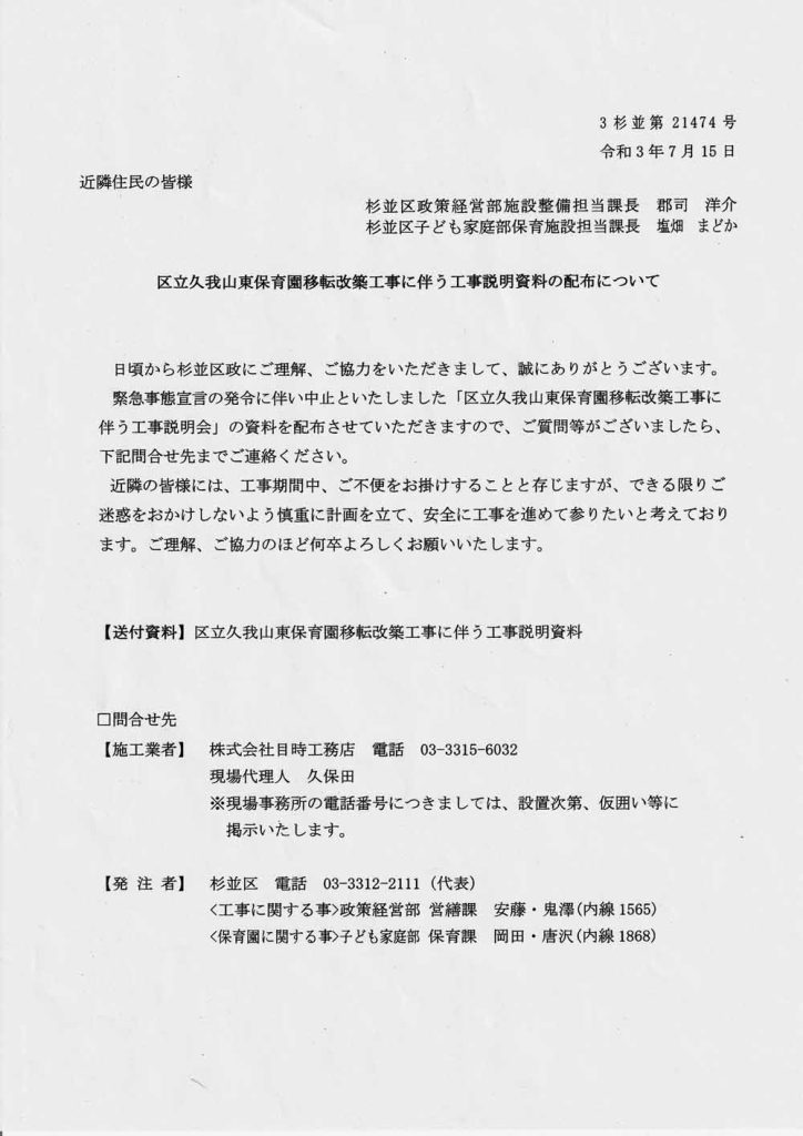杉並区立久我山東保育園移転改築工事【工事説明資料(抜粋)】