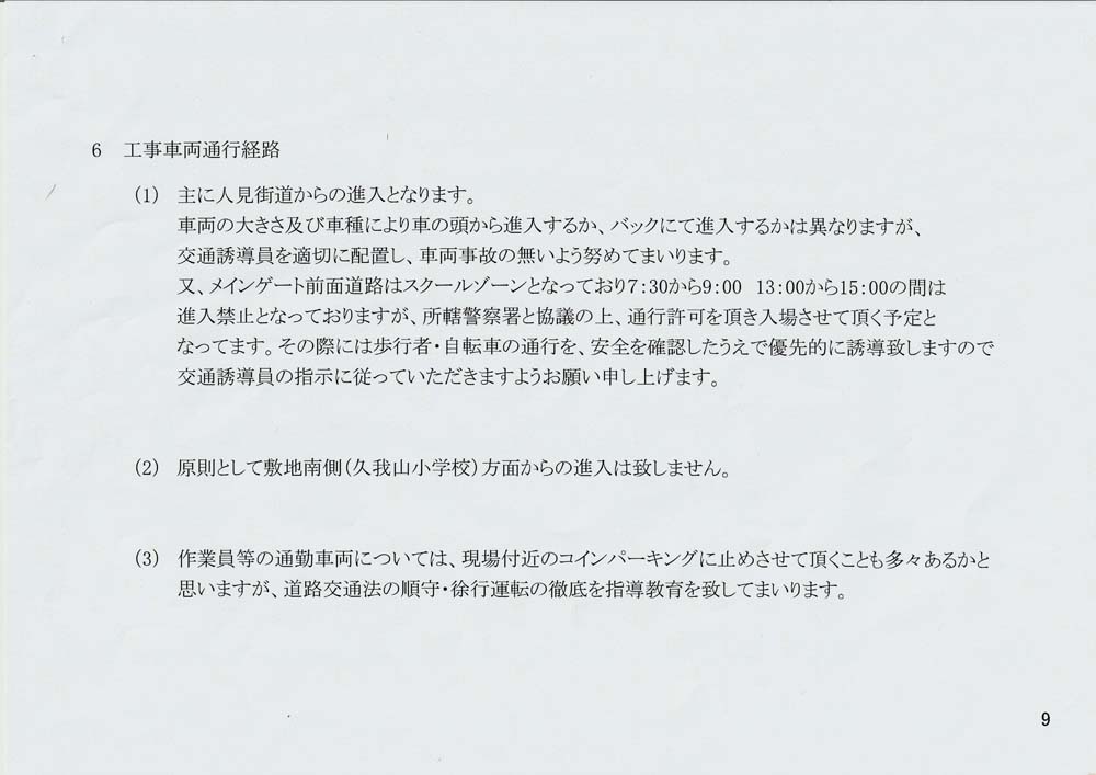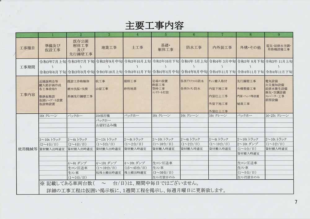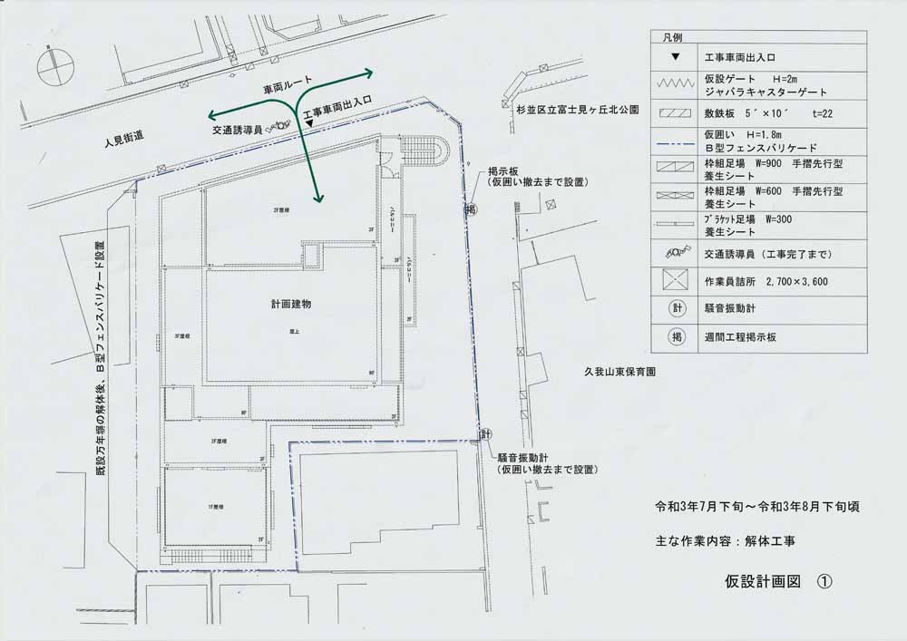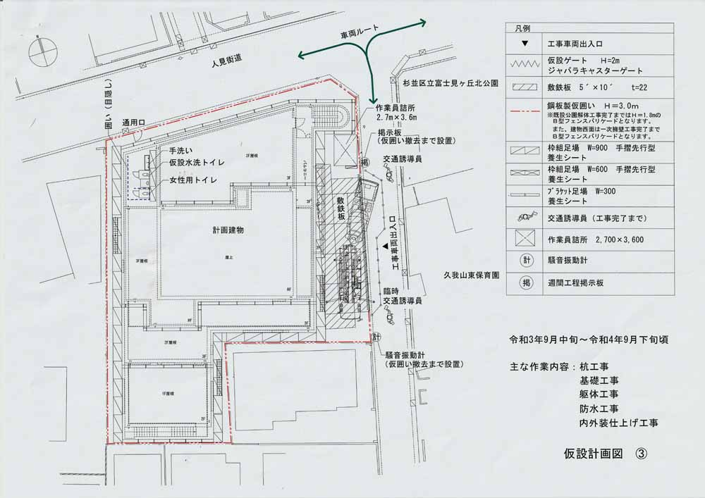 工期は「令和3年6月21日から令和4年11月30日まで」ですが、工事車両の出入りは「令和3年7月下旬から令和4年9月下旬頃まで」の8:00~18:00の間で、東側のスクールゾーン(7:30~9:00、13:00~15:00)は高井戸警察署の通行許可を受けた車両が進入する計画です。交通誘導員が配置されますが、通園・通学児童及び保護者や近隣住民は充分な安全確保をしてください。