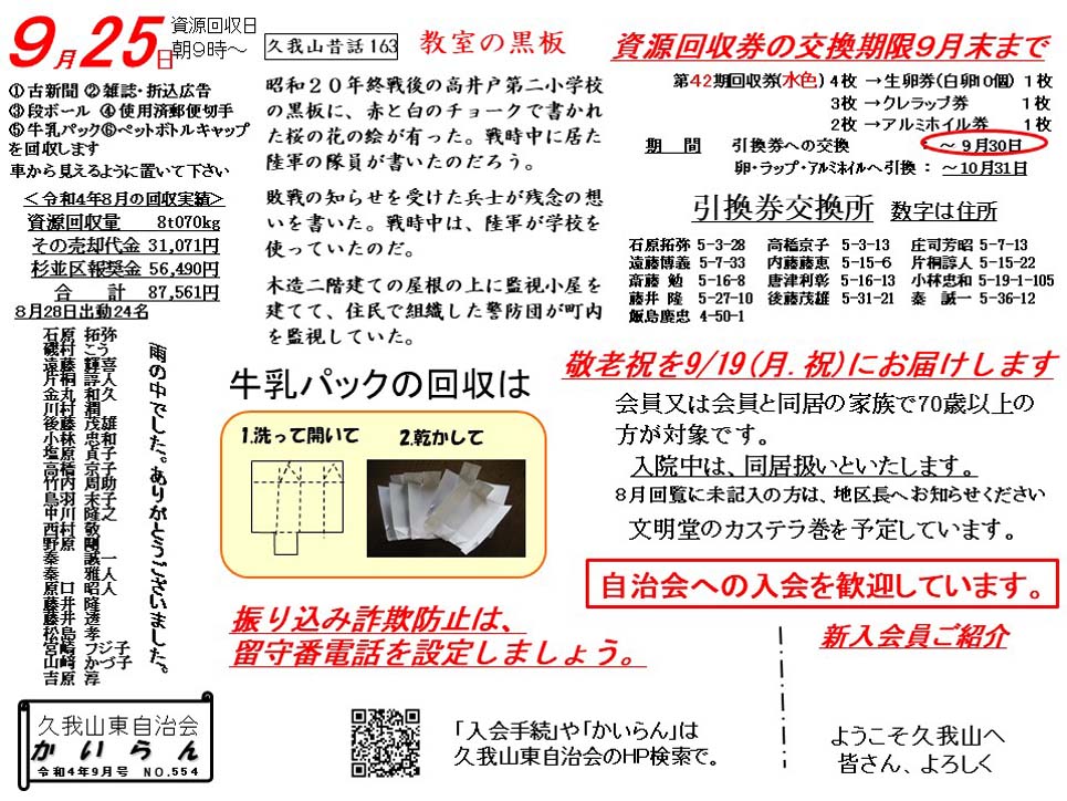 令和4年9月度回覧板 2022年9月1日 最終更新日時 : 2025年5月12日 KH01 コロナ禍収束見えず、バス旅行・お神輿の東地区巡行は中止です。資源回収券の交換期限は9月末です。 令和4年9月度回覧板