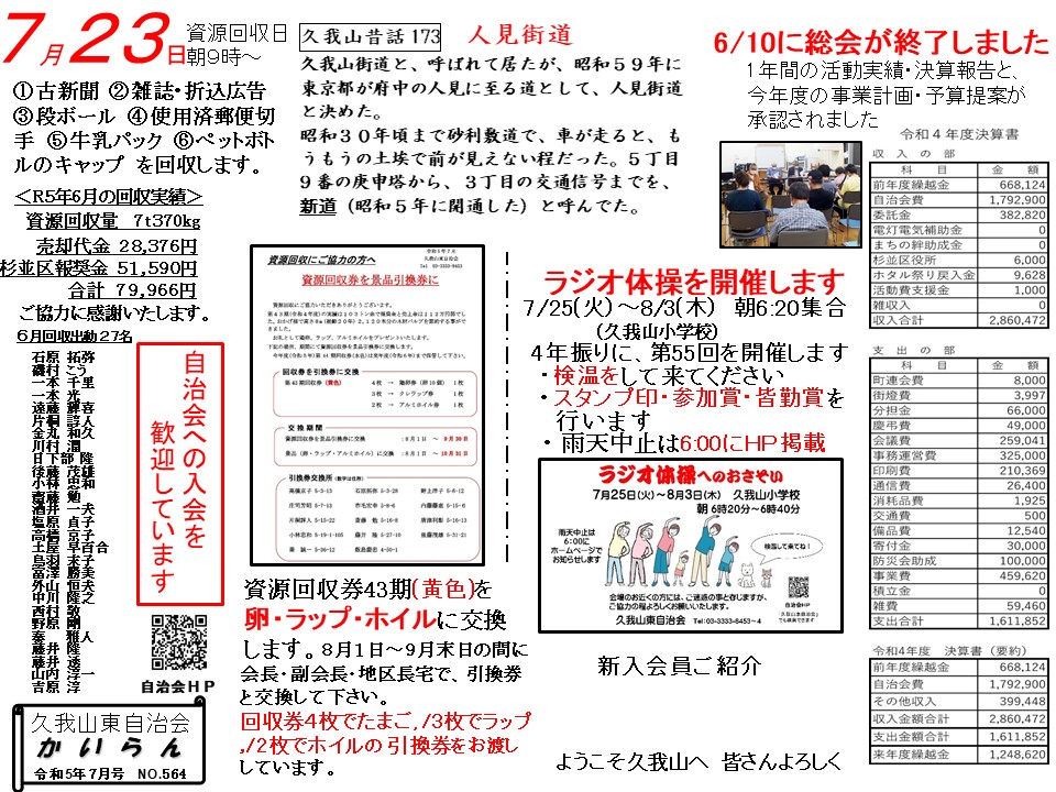 令和5年7月度回覧板 2023年7月1日 最終更新日時 : 2025年5月12日 KH01 4年ぶりのラジオ体操を7/25(火)~8/3(木)に開催!!自治会総会は6/10に開催済。 令和5年7月度回覧板