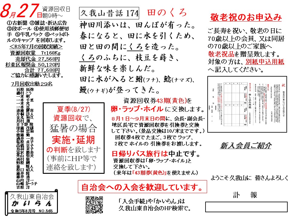 令和5年8月度回覧板 2023年8月1日 最終更新日時 : 2025年5月12日 KH01 ラジオ体操期間短縮して終了!。資源回収券→景品引換券の交換及び敬老祝の申し込みがスタート。 令和5年8月度回覧板
