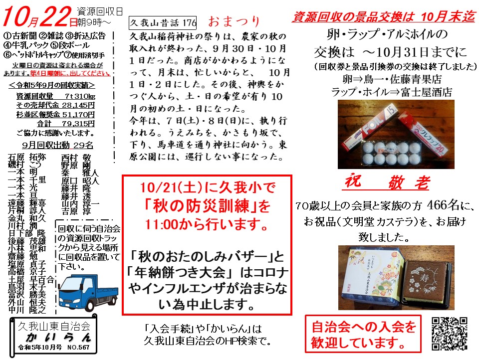 令和5年10月度回覧板 2023年10月1日 最終更新日時 : 2025年5月12日 KH01 秋の防災訓練は実施。恒例の餅つき大会は残念ながら中止。資源回収の景品交換期限は10月末です。お忘れなく! 令和5年10月度回覧板