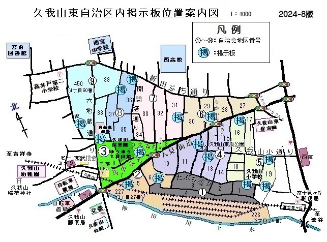 自治会掲示板の設置 2024年8月1日 最終更新日時 : 2025年5月10日 KH01 久我山自治会の地域に15か所の掲示板を設置しています。 会員へ回覧している「かいらん、広報物等」を広く掲載しています。