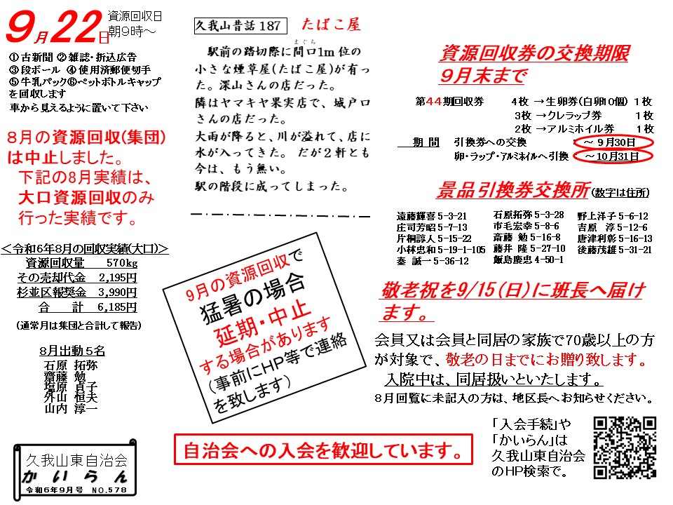 敬老祝は9/16(月)迄に贈呈。資源回収券交換は9/末迄に!