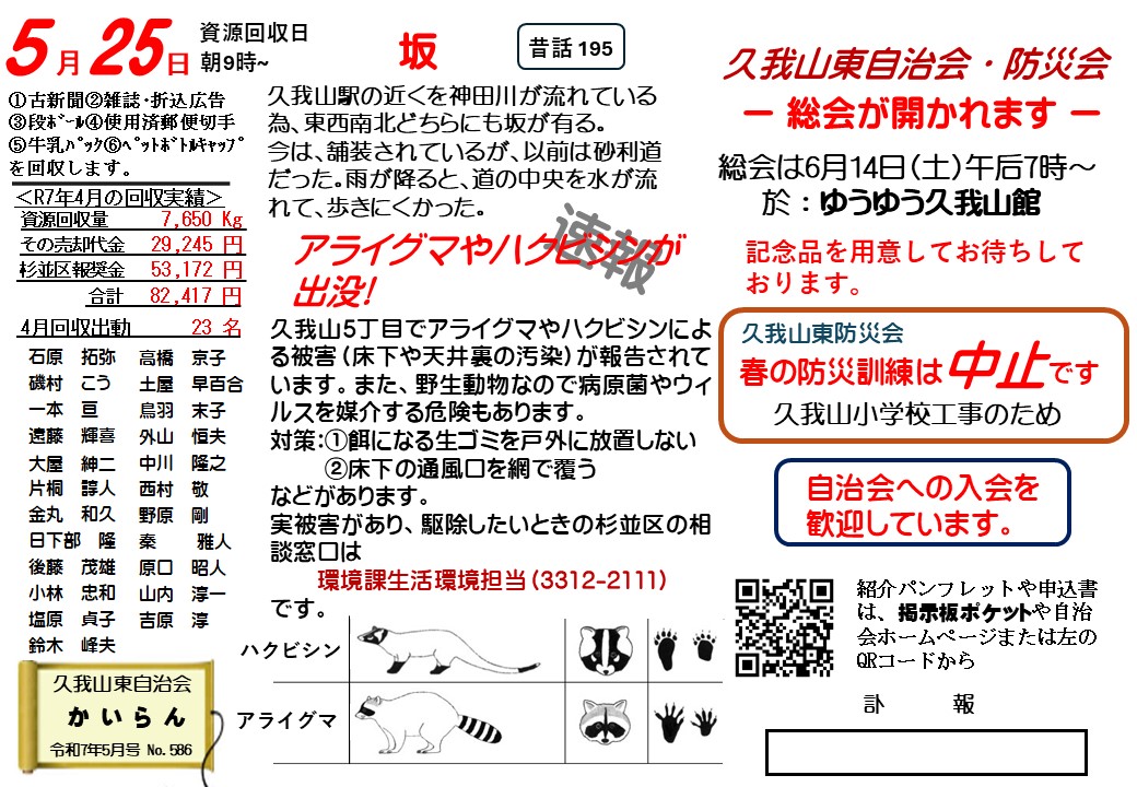 令和7年5月度回覧板 2025年5月1日 最終更新日時 : 2025年5月18日 KH01 ご注意ください!ハクビシンやアライグマが出没しています。自治会総会は6/14(土)開催予定 令和7年5月度回覧板