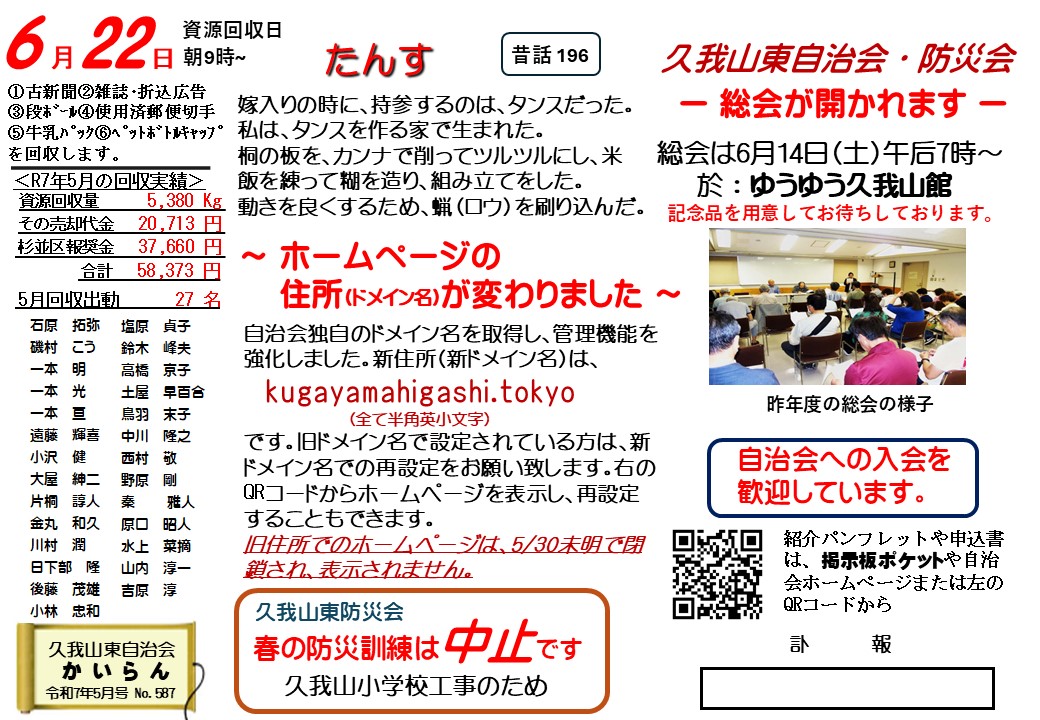 ホームページの住所(ドメイン名)が変更!自治会・防災会総会は6/14(土)ゆうゆう久我山館にて開催!