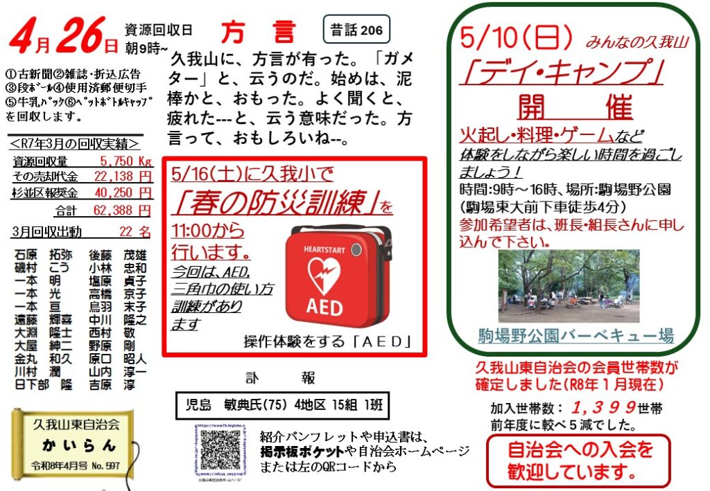 回覧板4月号です 2026年4月5日 最終更新日時 : 2026年4月5日 KH01 * 春の防災訓練は、5月16日11時から12時までの1時間で行われます。 * 昨年雨天のため中止となったデイ・キャンプを5月10日に開催します。参加してみませんか?