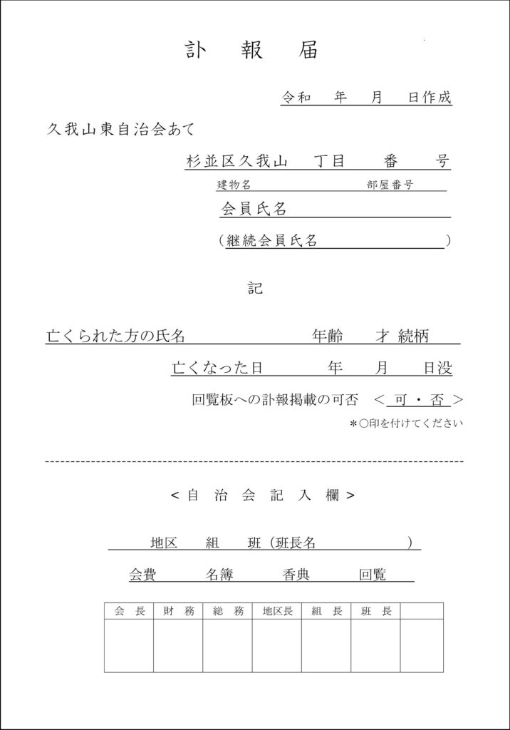 会員又は ご家族、お気づきになった近隣の方(会員)からご家族のご了解を頂いて、下記のフォームまたはダウンロードされた訃報届で申し込んでください。